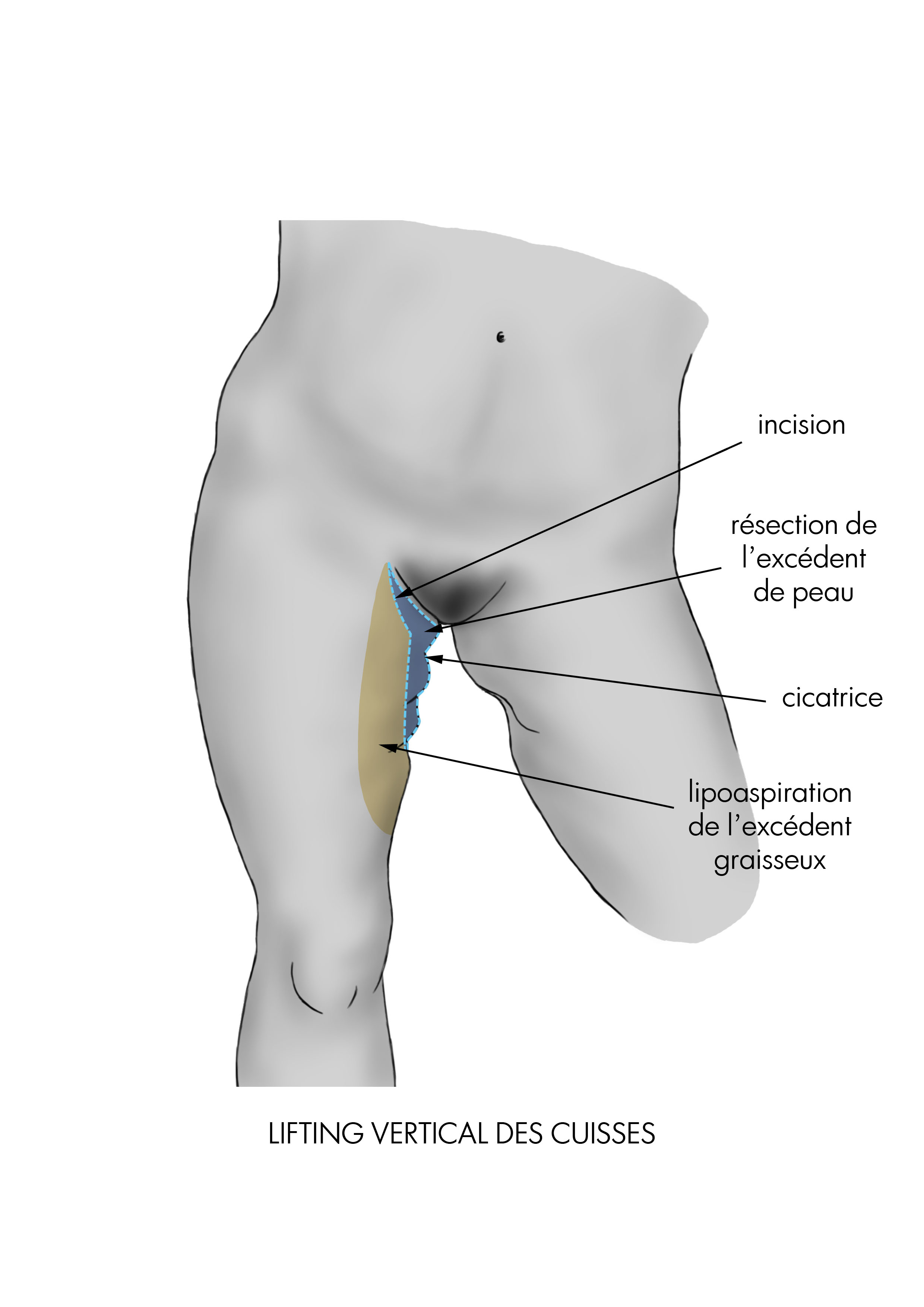 - Quand l’excès cutané est particulièrement sévère, il peut être nécessaire d’effectuer une cicatrice verticale à l’intérieur de la cuisse, de longueur variable.