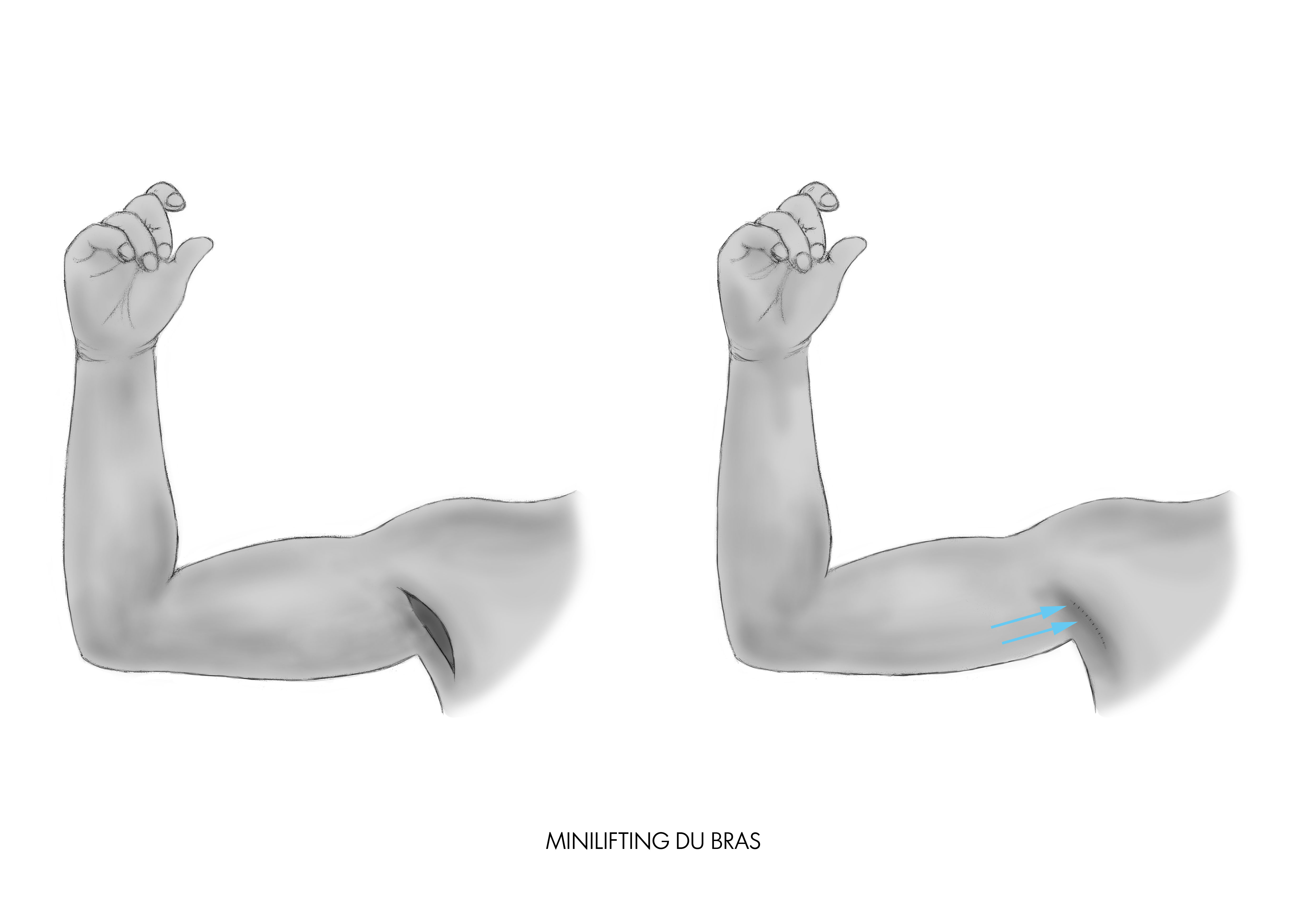 L’intervention commence par une liposuccion de la zone qui permet d’éliminer la graisse en excès, en préservant tous les vaisseaux lymphatiques et les nerfs pour une guérison plus rapide. On procède ensuite à l’élimination de l’excès de peau et à la mise en tension de la peau du bras.