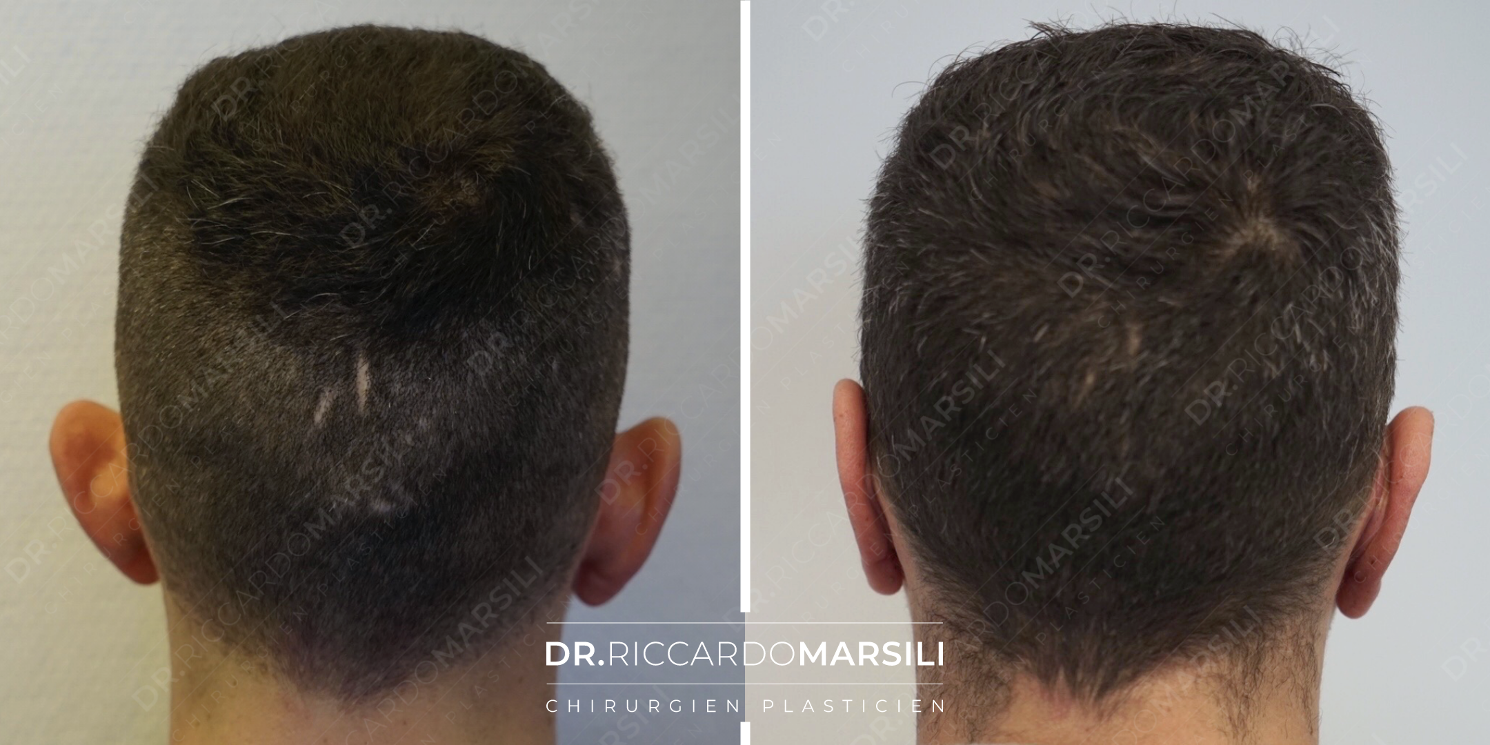 À la fin de l’intervention, on place un pansement compressif pour une durée de 5 à 7 jours qui est remplacé par une bande normale pour cheveux à garder une semaine. Il n’y a pas d’agrafes de peau à enlever.